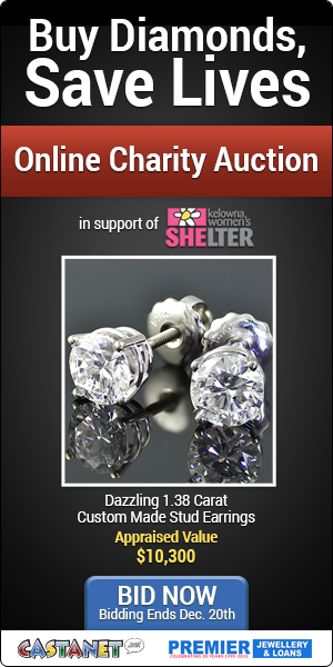 The Kelowna Women’s Shelter helps thousands of people yearly. Now, it’s our chance to help them! Premier Jewellery and Loans and Castanet Media are proud to present our annual Diamond Earring Fundraiser! The proceeds from this auction will go to helping women and children escape domestic violence. Last years auction raised $4,000. THESE earrings are bigger and have a higher clarity. Let’s see if we can’t set a record!