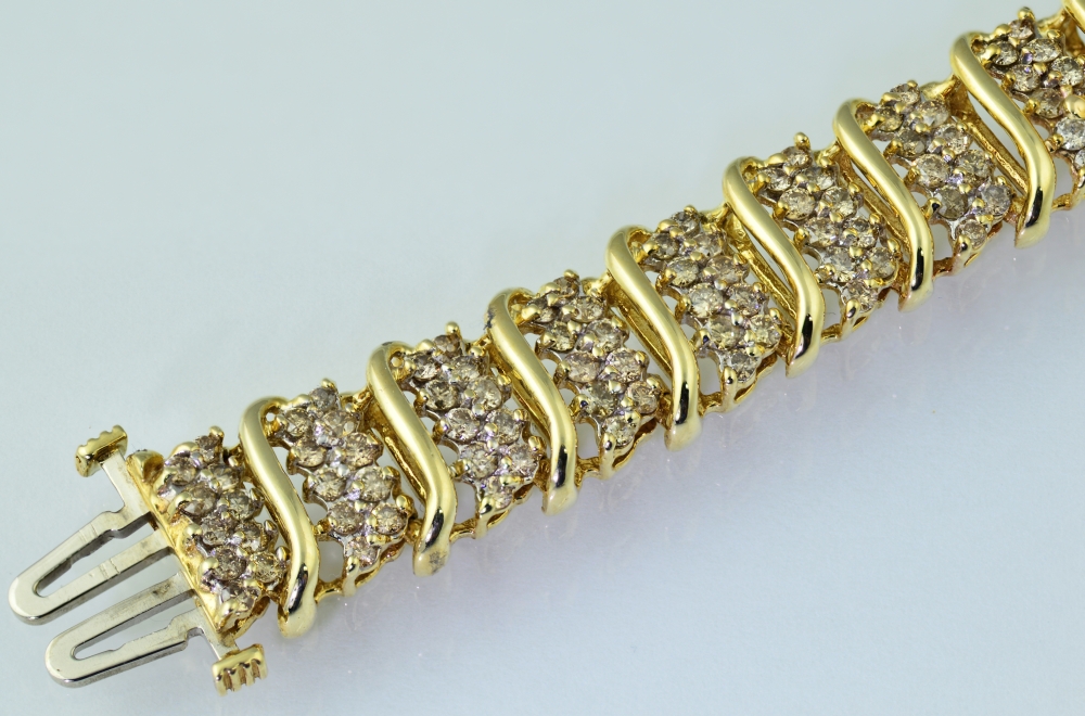 Wrap 280 brilliantly sparkling round diamonds, a total of 6 carats of diamonds , in the warm colour of 10 karat yellow gold around your wrist, you deserve something special. These 6 carats of diamonds are R to T in colour and SI to I clarity set in 20.6 grams of gold and a total of 7 inches.