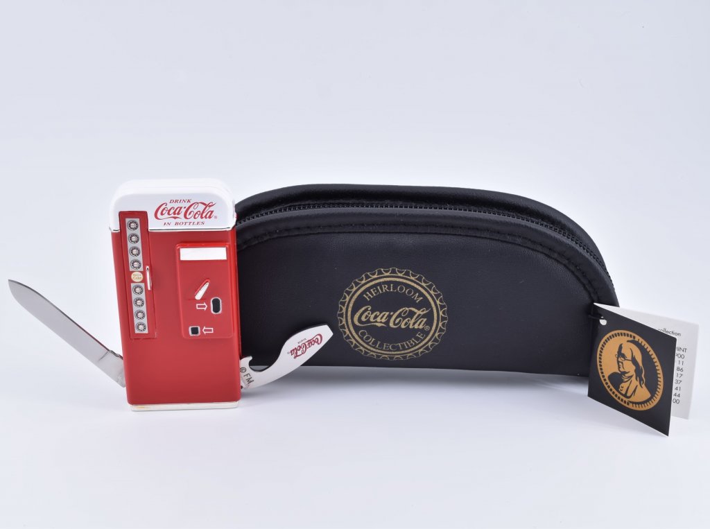 Still with original box and tags, this heavy and high quality vending machine replica contains a fold out bottle opener on one side, and a fold out knife on the other. Comes in padded zippered “Heirloom Coca-Cola Collectible†soft case. Makes a great gift!