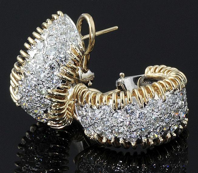 If you want to make a statement these earrings will do that. With 70 round brilliant cut diamonds equaling 3 carats set in the cool backdrop of 14 karat white gold and accentuated by the warm tone of yellow gold these earrings are simply glamourous.