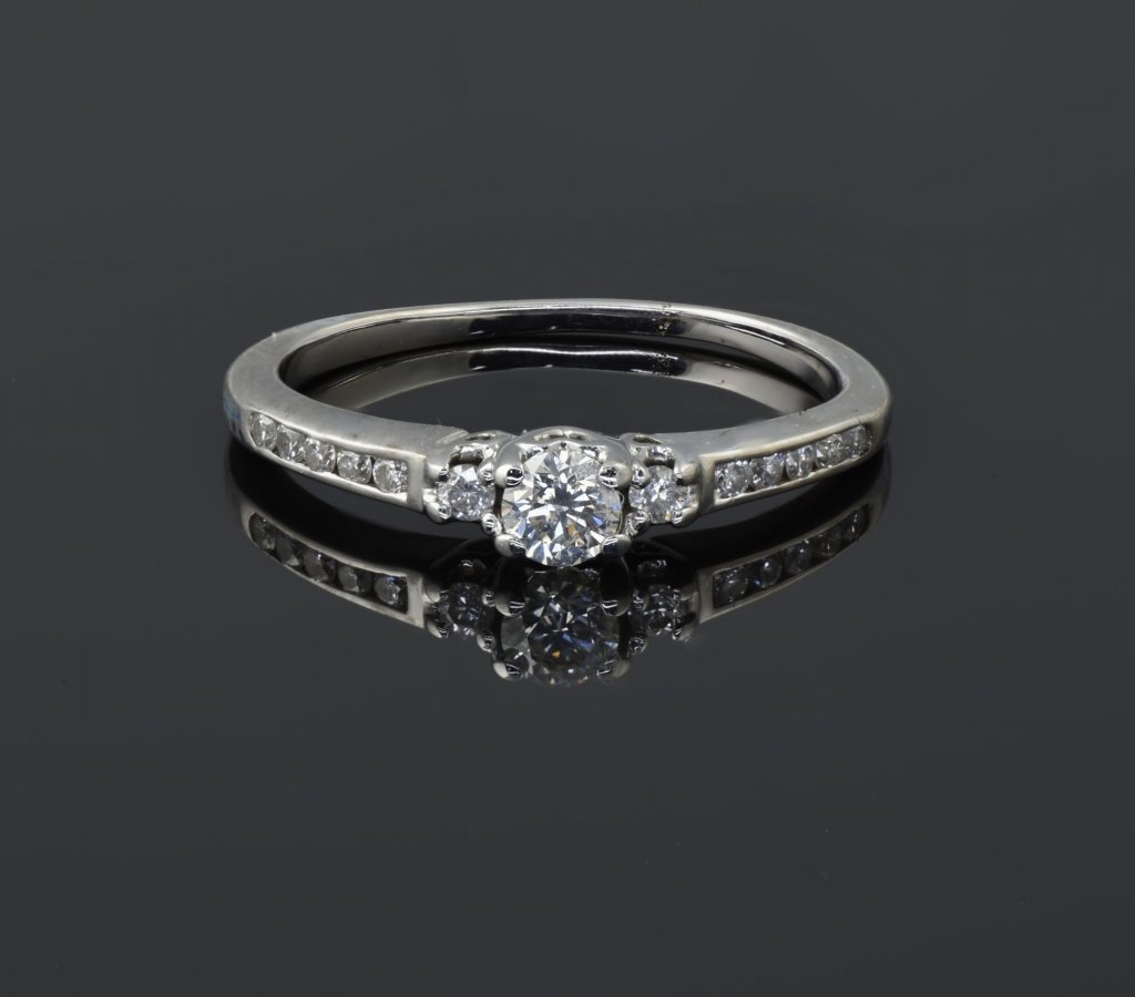 Three dazzling diamonds celebrate today, tomorrow and forever, together. This exceptional diamond ring will represent your journey together. In total this ring is created with 2.42 grams of gold set with 1/3rd of a carat of diamonds set in 14 karat white gold. Size 7.25.