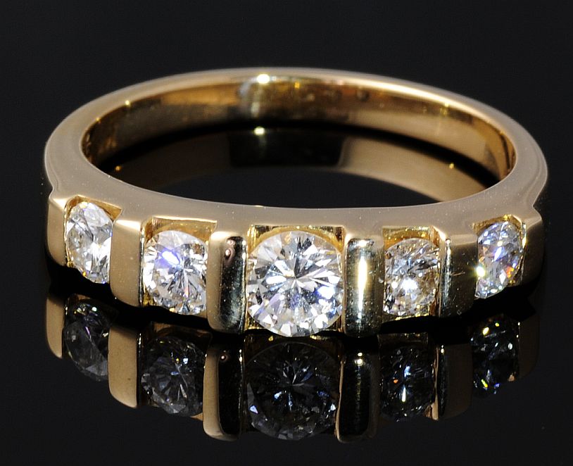 Five fabulous diamonds equaling over 1 carat and the warm tone of 14 karat yellow gold can become a symbol of love and togetherness. To slip on her finger on the day of your vows or as a promise on your anniversary to remember all your amazing years together and all the wonderful times to come this ring says “I love youâ€.