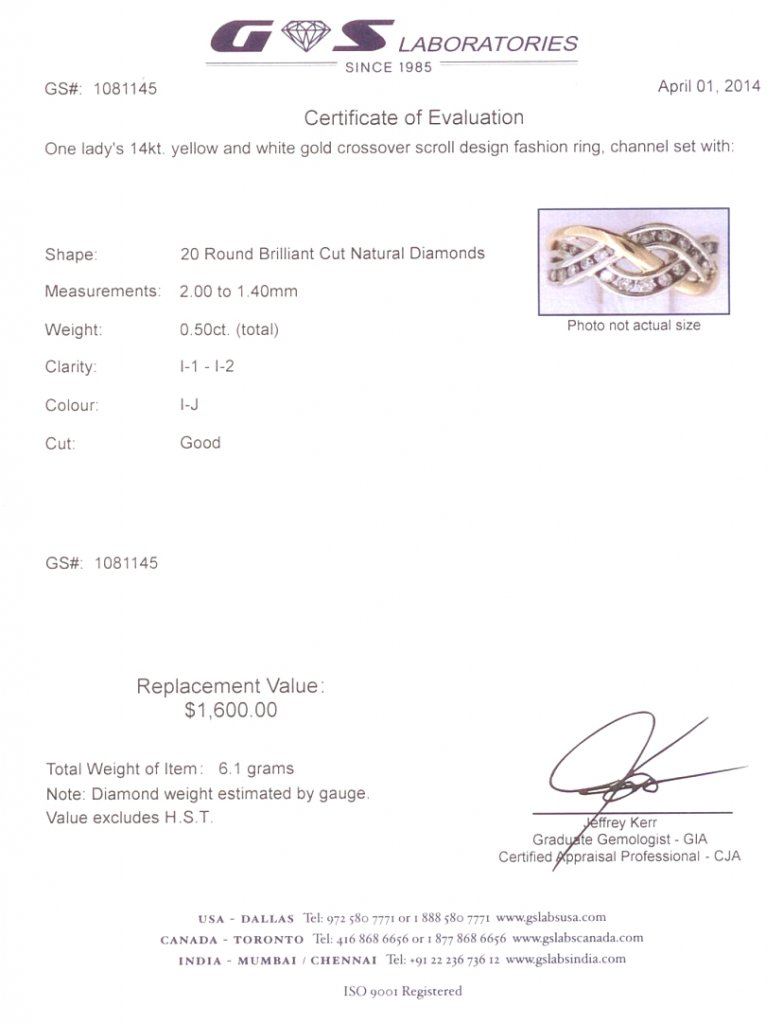 The intertwining of 14 karat yellow gold, white gold and 1/2 carat of dazzling diamonds make this unique band the perfect way to express your individuality. Wearing it as a wedding band or for a fashionable everyday ring this band hold 0.5 carats of I to J colour and I clarity diamonds in 5.1 grams of gold. Size 5.75.