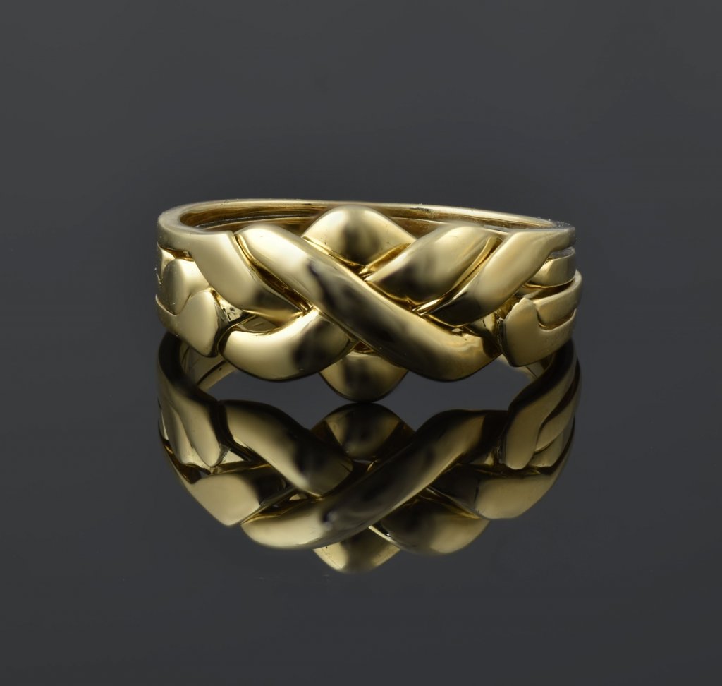 Tease you brain no matter where you are. This ring is not just a statement of fashion, it is also a puzzle that you can take apart and build anywhere. In total this ring is 4.38 grams of 14 karat yellow gold. Size 7.