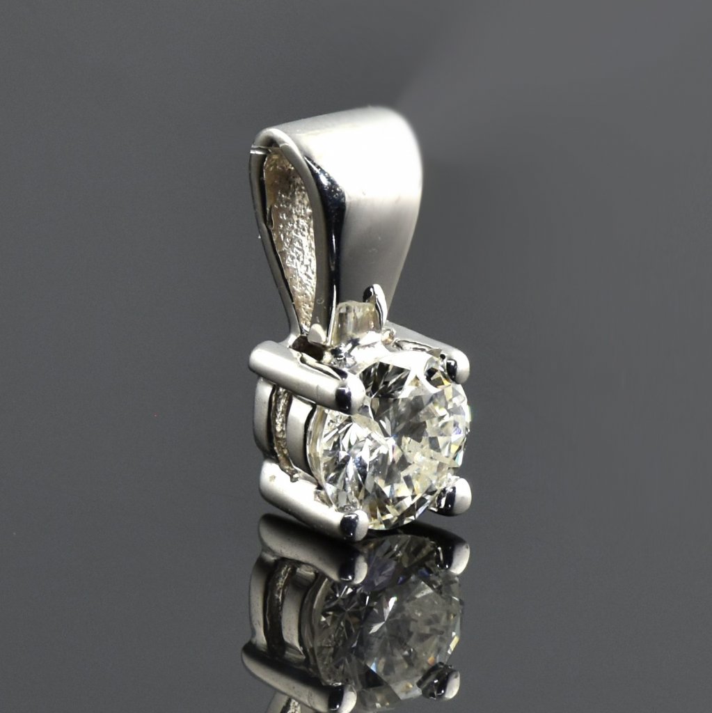 A super sparkling diamonds suspended around her neck, a simple and sensational gift idea. Get this close to 1/2 carat diamond solitaire set in the cool tone of white gold for your next special event, she will be glad you did. This sensational diamond is 0.46 carats set in 1 gram of 14 karat gold.