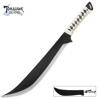 This exclusive fantasy fortress short sword features solid stainless steel construction with a black, baked-on finish. The powerful 17 1/2″ scimitar-style blade delivers excellent chopping and slashing power. The stylish handle is graciously wrapped in simulated leather for a comfortable grip. Includes heavy-duty nylon sheath. Measures 27 1/2″ overall.
