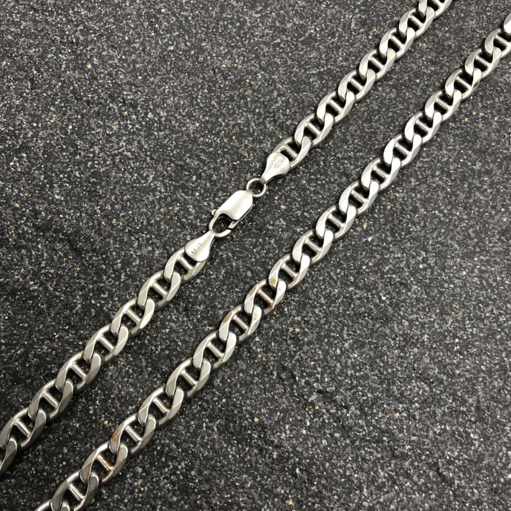 Simple, suave and something unique! This mariner link chain may be just what you’re after. Something slightly different compared to a classic curblink yet just as strong. In total this chain is 37.74 grams of sterling silver and it is 21 inches long.