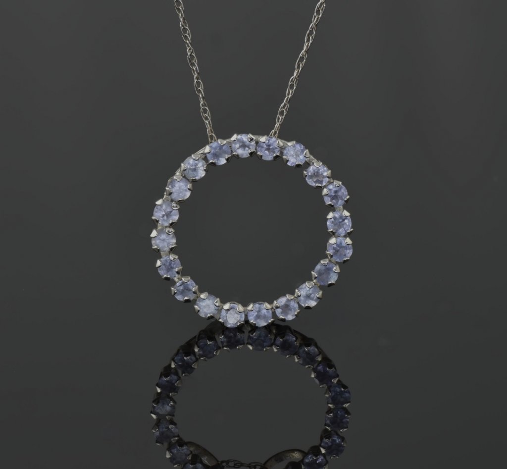 An eternity of the perfect colour of purple! This beautiful necklace is created with a ring of brilliant purple gems set in the cool colour of white gold. This necklace set is created with 10 karat white gold and is a total of 0.93 grams. The chain for this necklace is 18 inches long.