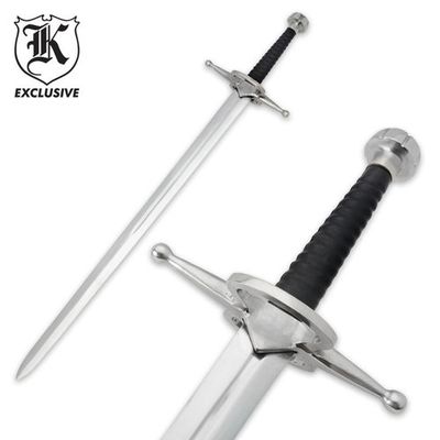 Dating from the 15th and 16th Centuries, and possibly even earlier times, the Two Handed Great Sword has long been heralded as a legend of fierce hand-to-hand combat. Particularly prevalent in Medieval and Renaissance-era Europe, these ancient swords often weighed in at more than 20 pounds in order to effectively penetrate heavy combat armor. This highly detailed replica features heavy duty, solid stainless steel construction. Like its ancient predecessors, this sword offers a very heavy guard with dual sided rings to protect the hands from the opponent’s sword. The rings on either side of the guard prevent the opponent’s sword from sliding down the blade and striking the warrior’s hands. A deep blood groove spans a large portion of the blade, and the handle offers a secure grip and detailed pommel designed to smash anything that comes its way. At 45″ in length, this replica abounds with scrupulous, historic detail.