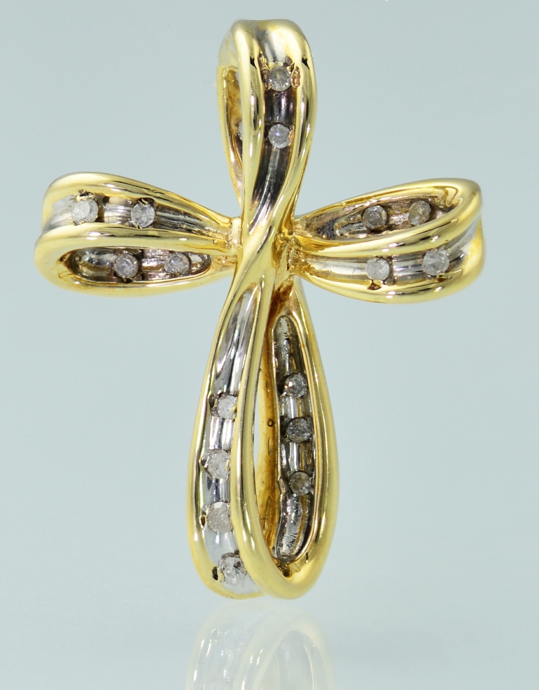 This truly enchanting symbol of faith is made of 10 karat yellow gold and will sparkle brilliantly with 1/10 carat of diamonds. This pendant is built with 2.17 grams of gold and set with 0.09 carat of diamonds.